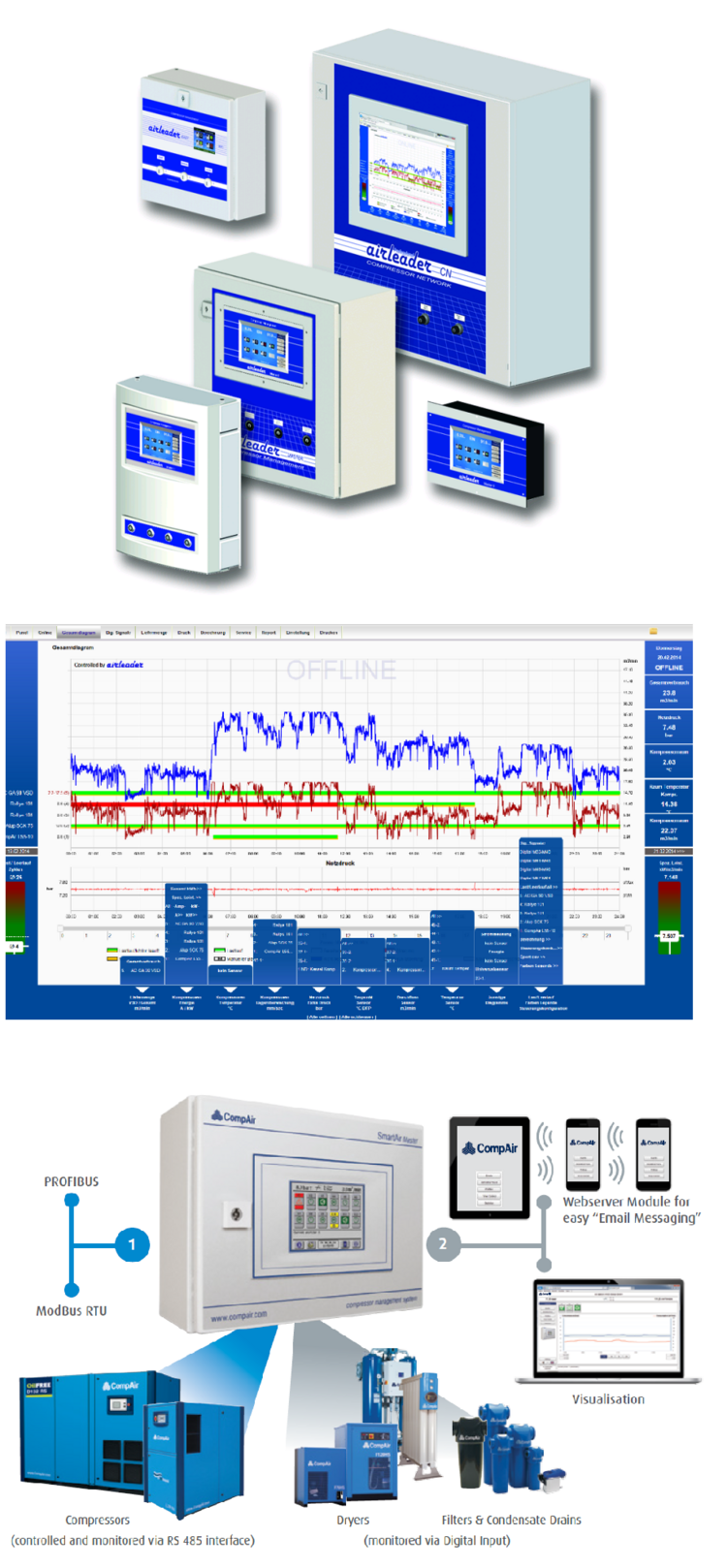 Eine moderne Kompressorsteuerung ist in der Lage Kompressoren unterschiedlicher Bauart, Leistung und Größe so zu steuern, dass sie in Abhängigkeit vom jeweils aktuellen Druckluftbedarf, maximal effizient zusammenarbeiten.