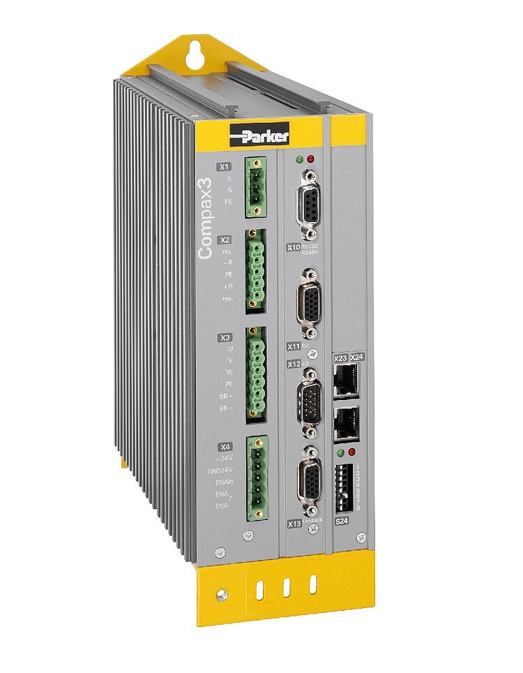 Compax3, das globale Antriebssystem von Parker bietet eine umfangreiche Produktpallette von Ein- und Mehrachsantriebe sowie Hydraulikreglern. Der stand-alone Einachs – Servoantrieb mit Steuerungsfunktionen Compax3S ist im Leistungsbereich 1 … 25 kVA mit Eingangspannungen 1/3*230 VAC … 3*480 VAC erhältlich.