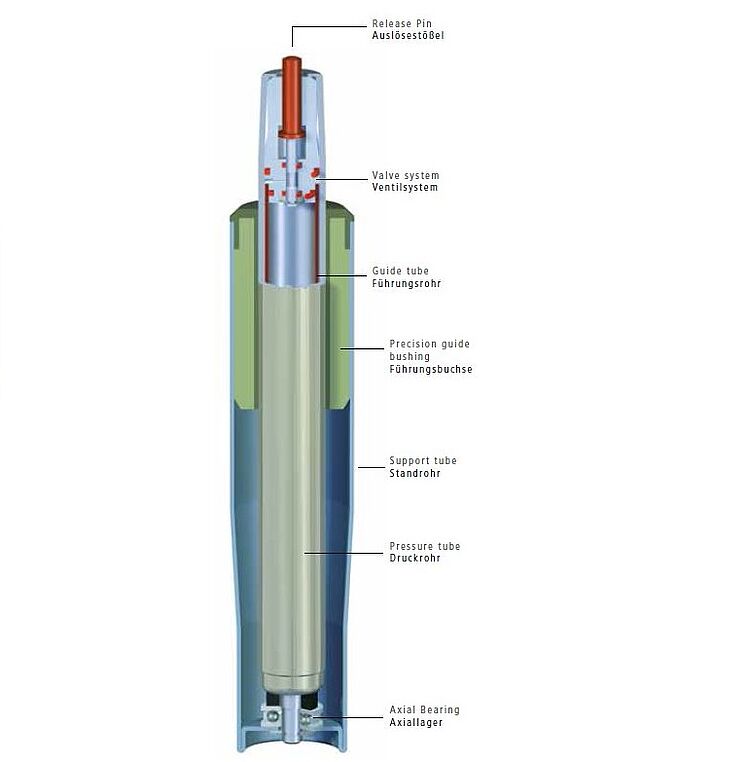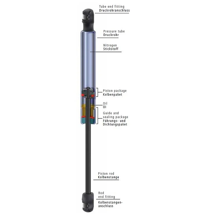 Die Gasfeder ist ein hydropneumatisches Verstellelement und besteht aus Druckrohr, Kolbenstange mit Kolben sowie geeigneten Anschlüssen. Sie ist mit komprimiertem Stickstoff gefüllt, der bei gleichem Druck auf verschieden große Kolbenquerschnittsflächen wirkt. Daraus resultiert eine Kraft in Ausschubrichtung. Diese Ausschubkraft kann innerhalb physikalischer Grenzen durch die geeignete Wahl des Fülldruckes exakt festgelegt werden.