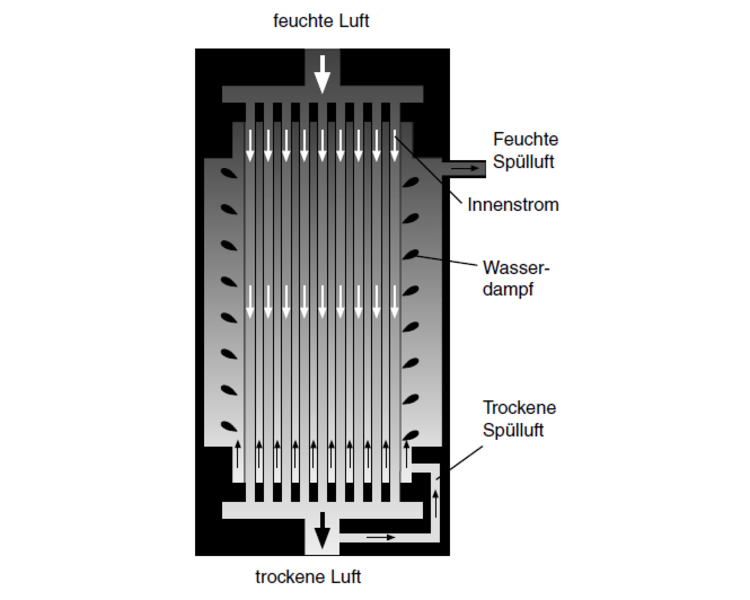 Für die richtige Funktion ist es wichtig, dass ein Konzentrationsgefälle zwischen dem Inneren und dem Äußeren der Hohlfaser vorhanden ist. Dann kann die feuchte Druckluft durch das Innere der Hohlfaser fließen (Innenstrom) und dabei den enthaltenen Wasserdampf durch die Beschichtung nach außen abgeben. Ein sogenannter Spülluftstrom wird anschließend vom Hauptstrom abgezweigt und entspannt.