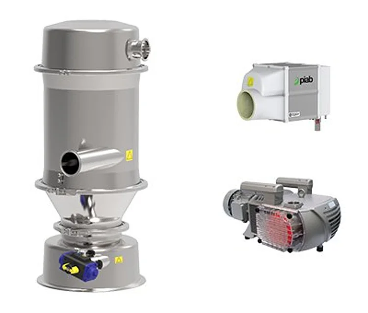 Dies ist der geeignete Förderer, wenn eine Premium-Technologie erforderlich ist, wie z.B. in der Lebensmittel-und Pharmaindustrie. Er macht auch Sinn, wenn es eine Anforderung auf hohe Durchsatzleistungen mit einer kleinen Stellfläche gibt. Der piFLOW®p Kapazitätsbereich ist sehr groß - von 2 Liter Chargenvolumen bis zu 56 Litern. Alle Förderer sind entweder mit einer Ejektor betriebenen Vakuumpumpe oder mit einer mechanischen Pumpe verfügbar.