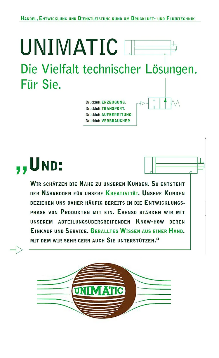 Mit Zugriff auf die Sortimente der namhaften europäischen und internationalen Hersteller und mit der Servicebereitschaft der Unternehmen der Technosalesgruppe (deren Initiator UNIMATIC ist) und vor allen Dingen mit dem Engagement unserer qualifizierten Mitarbeiter, deren Kreativität aus Neugier, Servicebereitschaft, Kundenorientierung und dem Willen zum Erfolg besteht. Mit anderen Worten: Unsere Mitarbeiter haben „Biss“ und entwickeln Ihnen die Lösung Ihrer Aufgabenstellung maßgeschneidert.